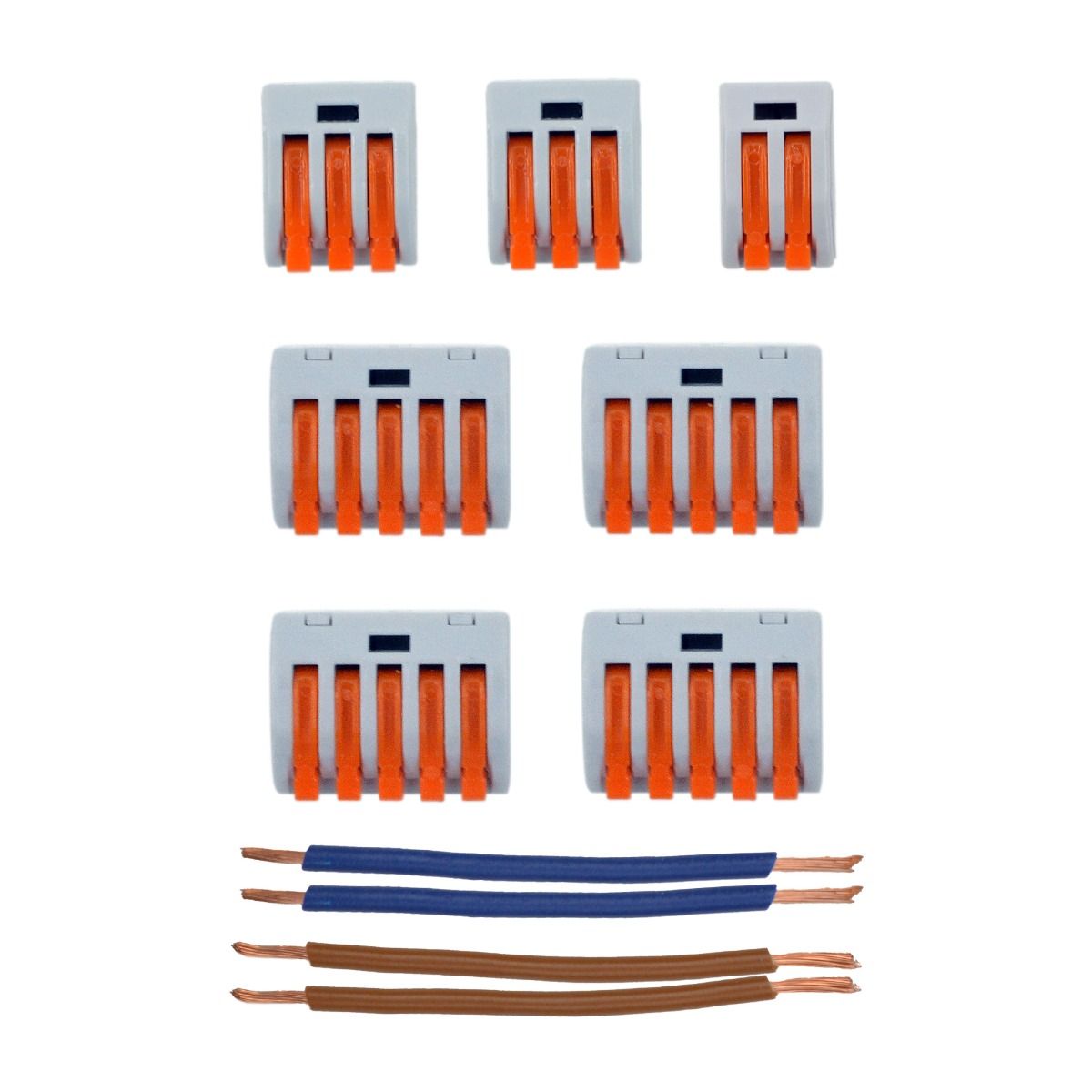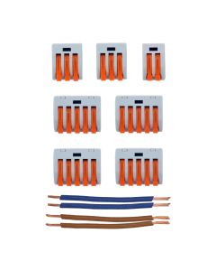 Informations complémentaires | Le kit de connexion comprend : 1 borne à 2 pôles, 2 bornes à 3 pôles et 4 bornes à 5 pôles, ainsi que 2 câbles bleus et 2 câbles bruns. |